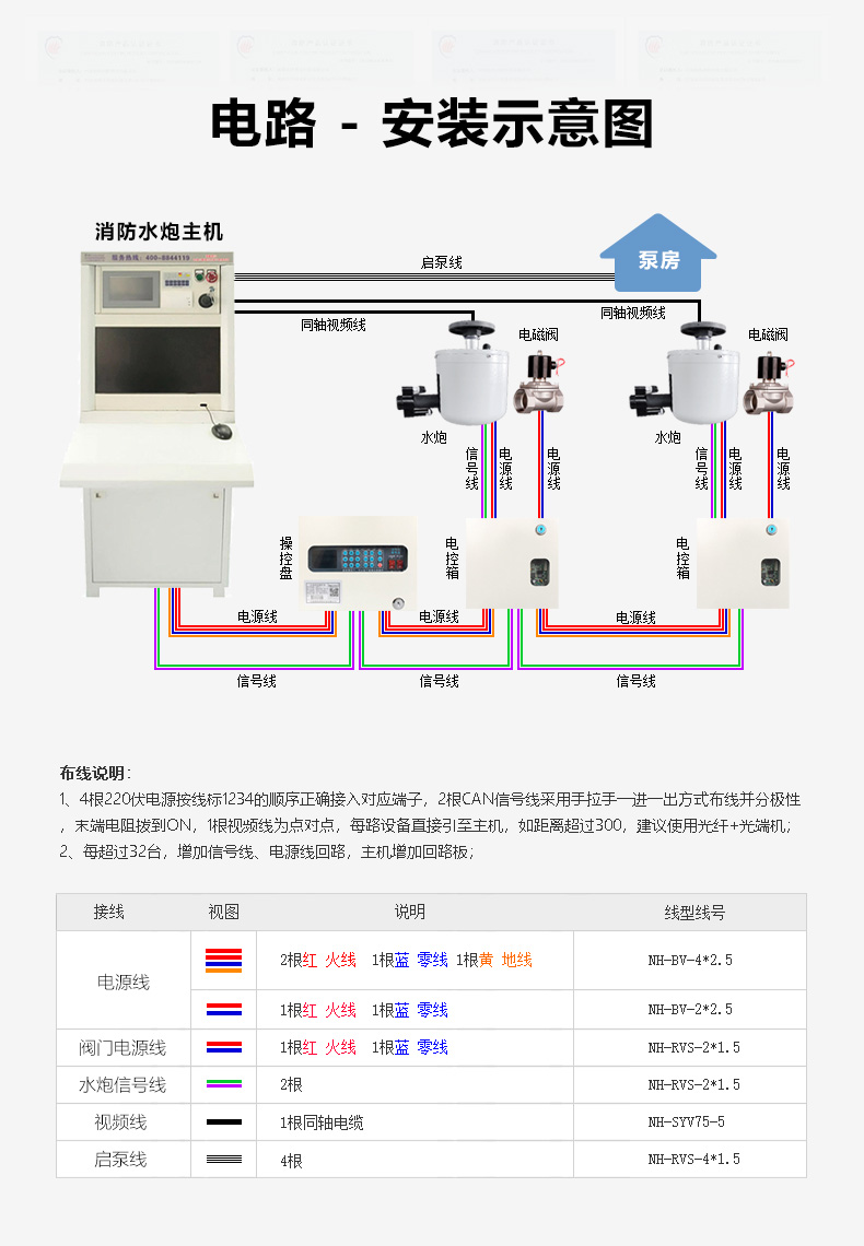4、水炮自带的电缆,安装时要预留一定的长度使其自身能自由旋转;