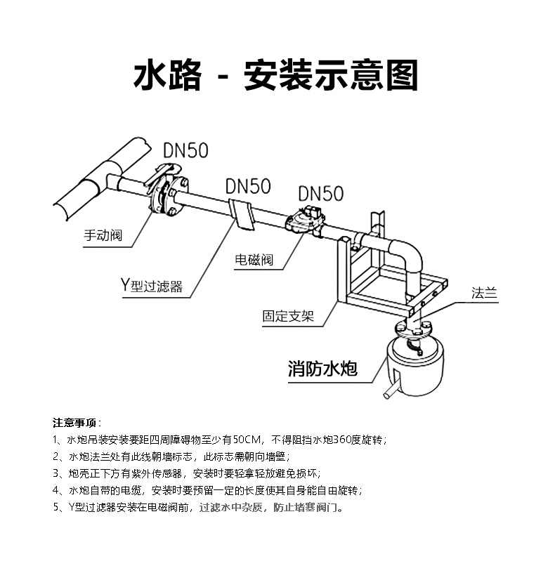 1、水炮吊装安装要距四周障碍物至少有60CM,不得阻挡水炮360度旋转;